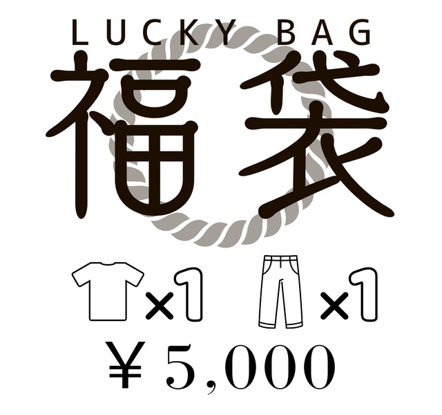 【商品名】 LUCKY BAG ¥5,000|Tee & Pants Set 【説明文】 半袖Tシャツ1点+長ズボン1点の2点セット。 トップス・ボトムスともに着回しやすいアイテムをセレクトし、 単体でも活躍する内容になっています。 サイズはL〜XLのみ。 数量限定、店頭在庫連動のため売り切れ御免。 年に一回しかやらない福袋なので、 運試し感覚で楽しんでいただけたら。
