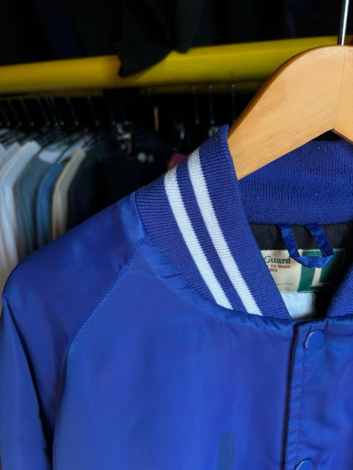 ぱっと目を惹く鮮やかなブルーに、ストライプリブのアクセントが効いたナイロンスタジャン。