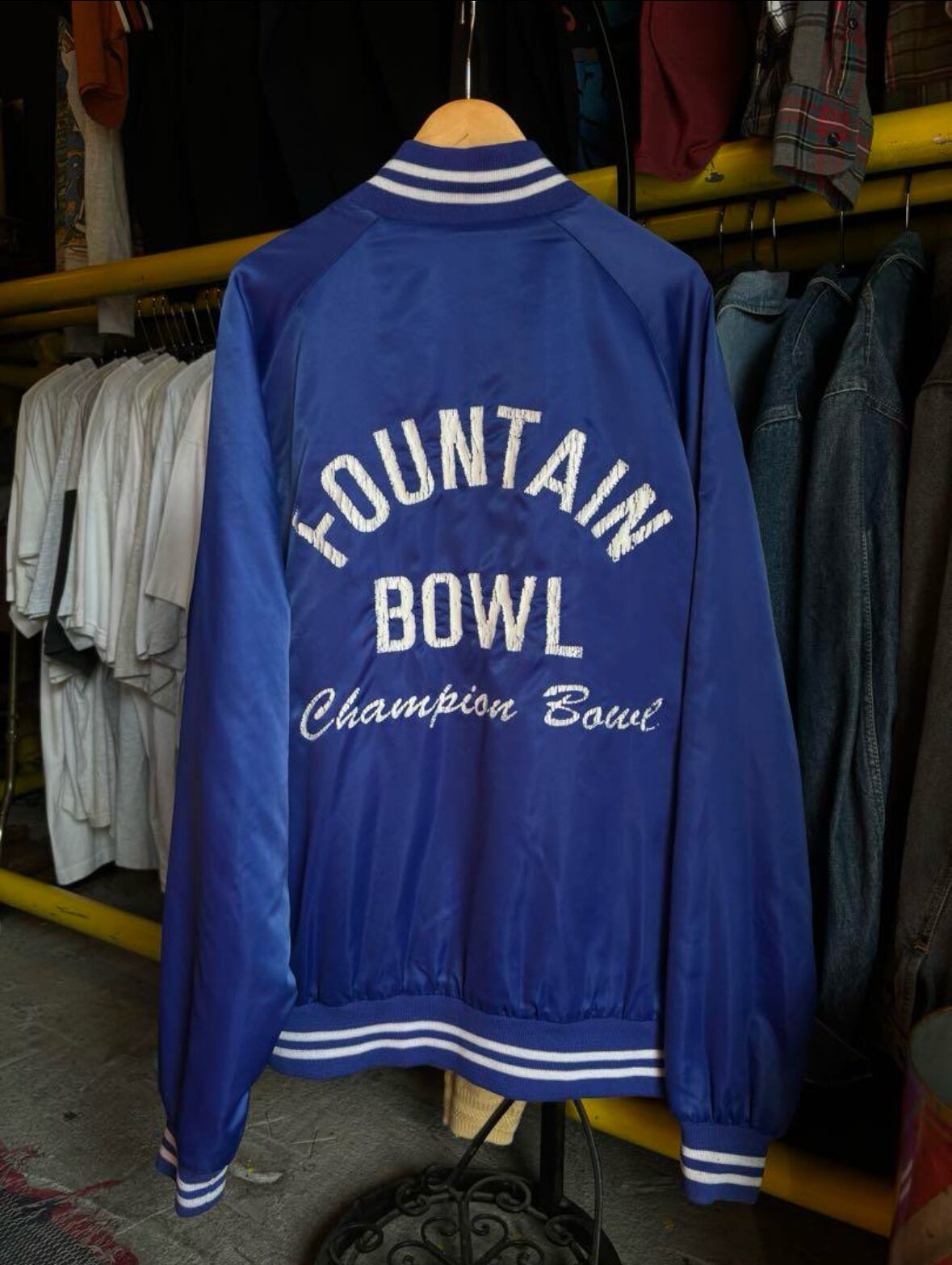 背面には「Fountain Bowl」「Champion Bowl」のプリント入りで、アメリカのローカルボウリング場スタッフを思わせるグッドな空気感。