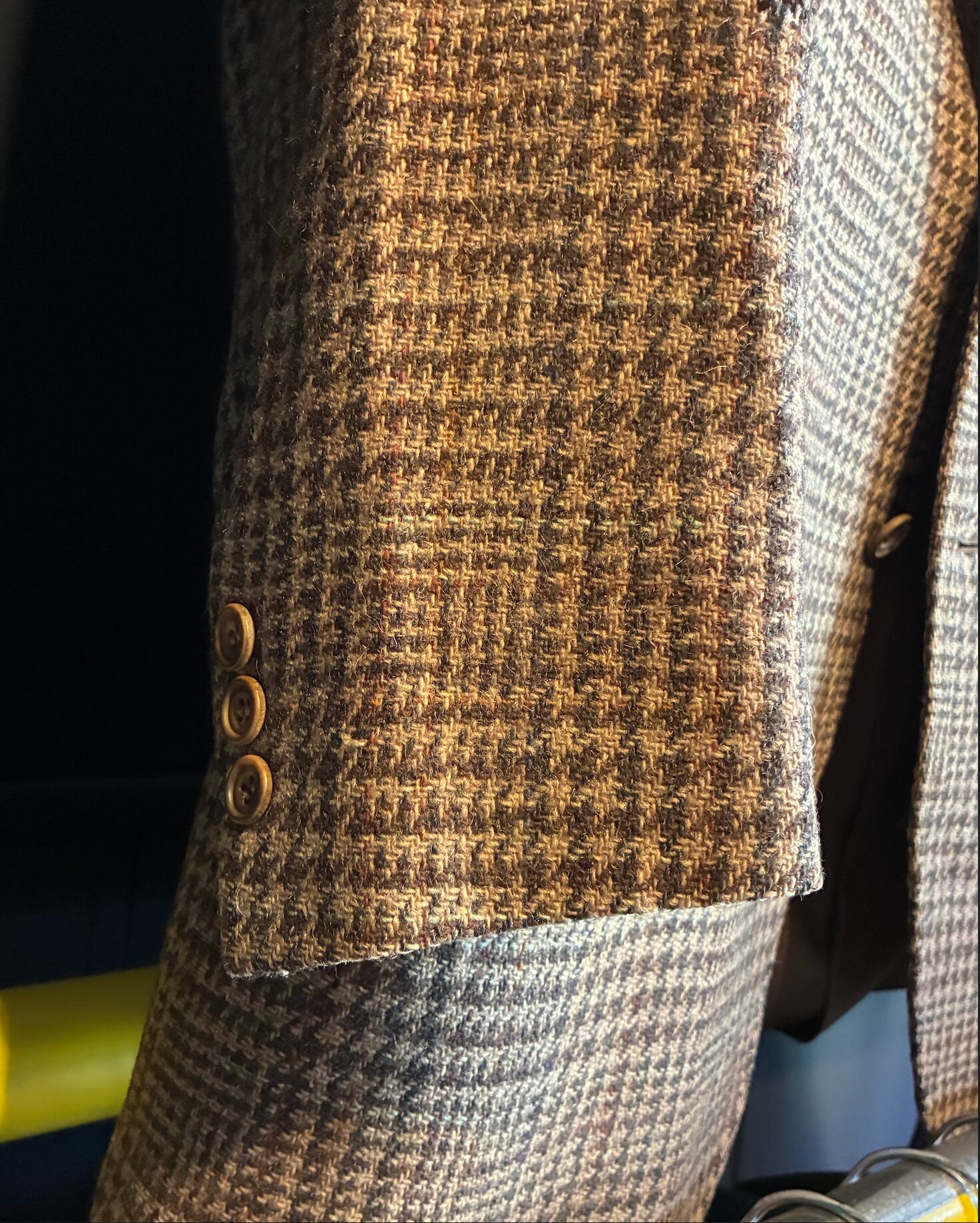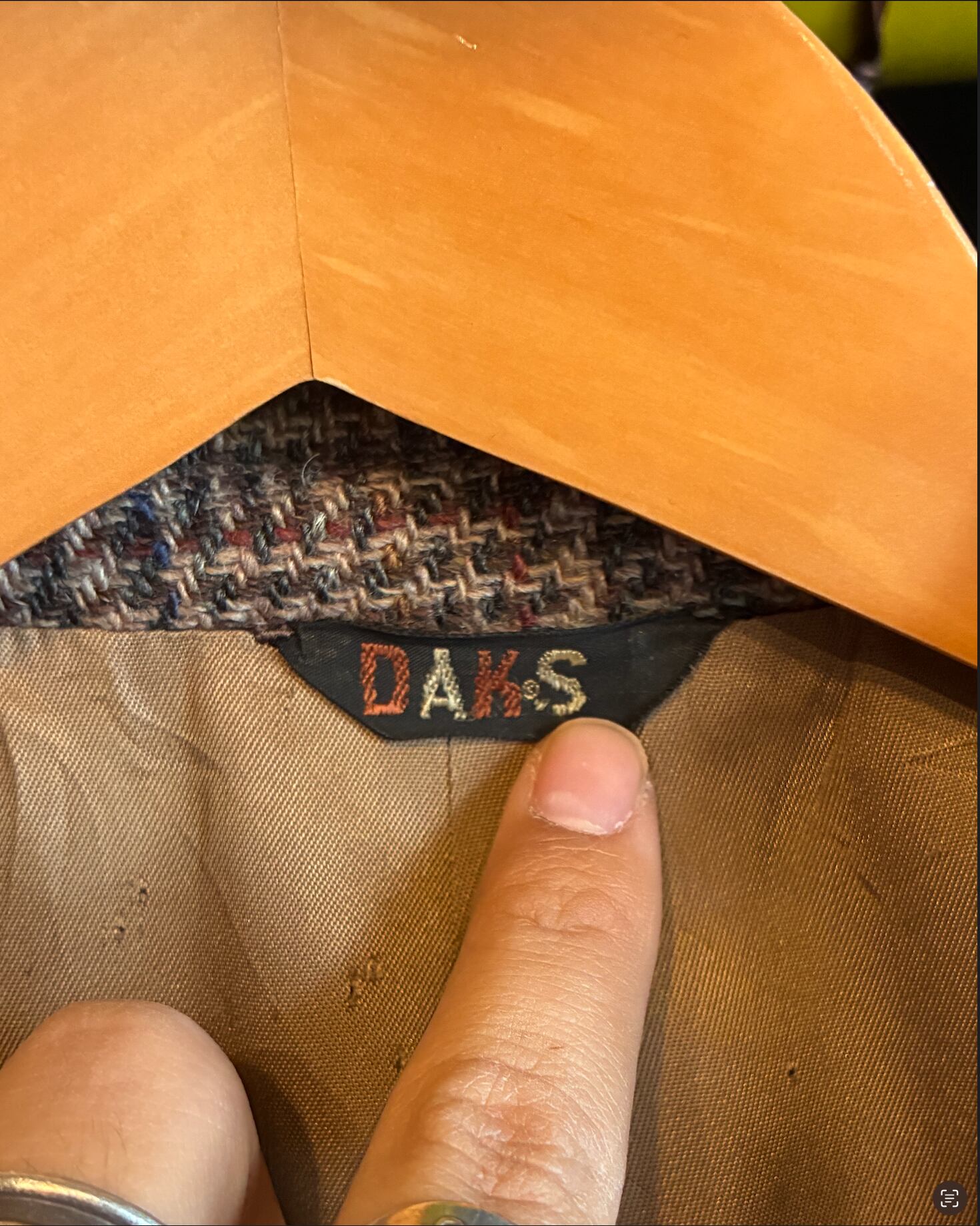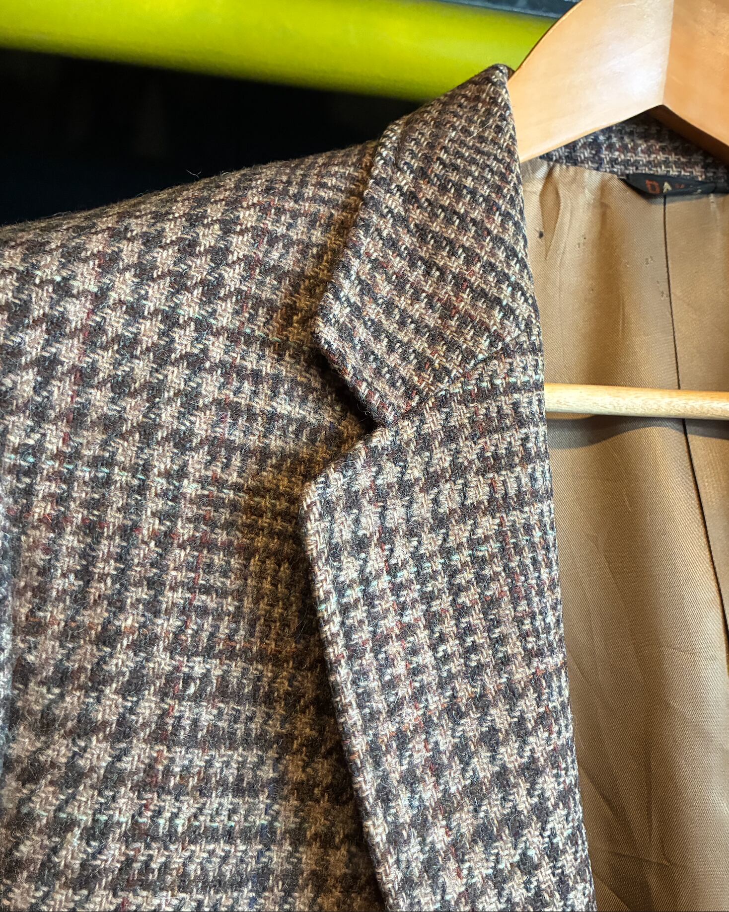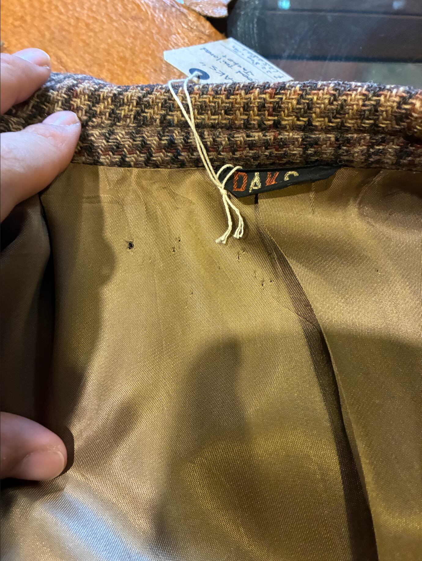 イギリスの名門DAKSによるツイードジャケット。落ち着いたブラウンベースの生地に、アクセントとして織り込まれたターコイズブルーの糸が非常に美しい一着です。