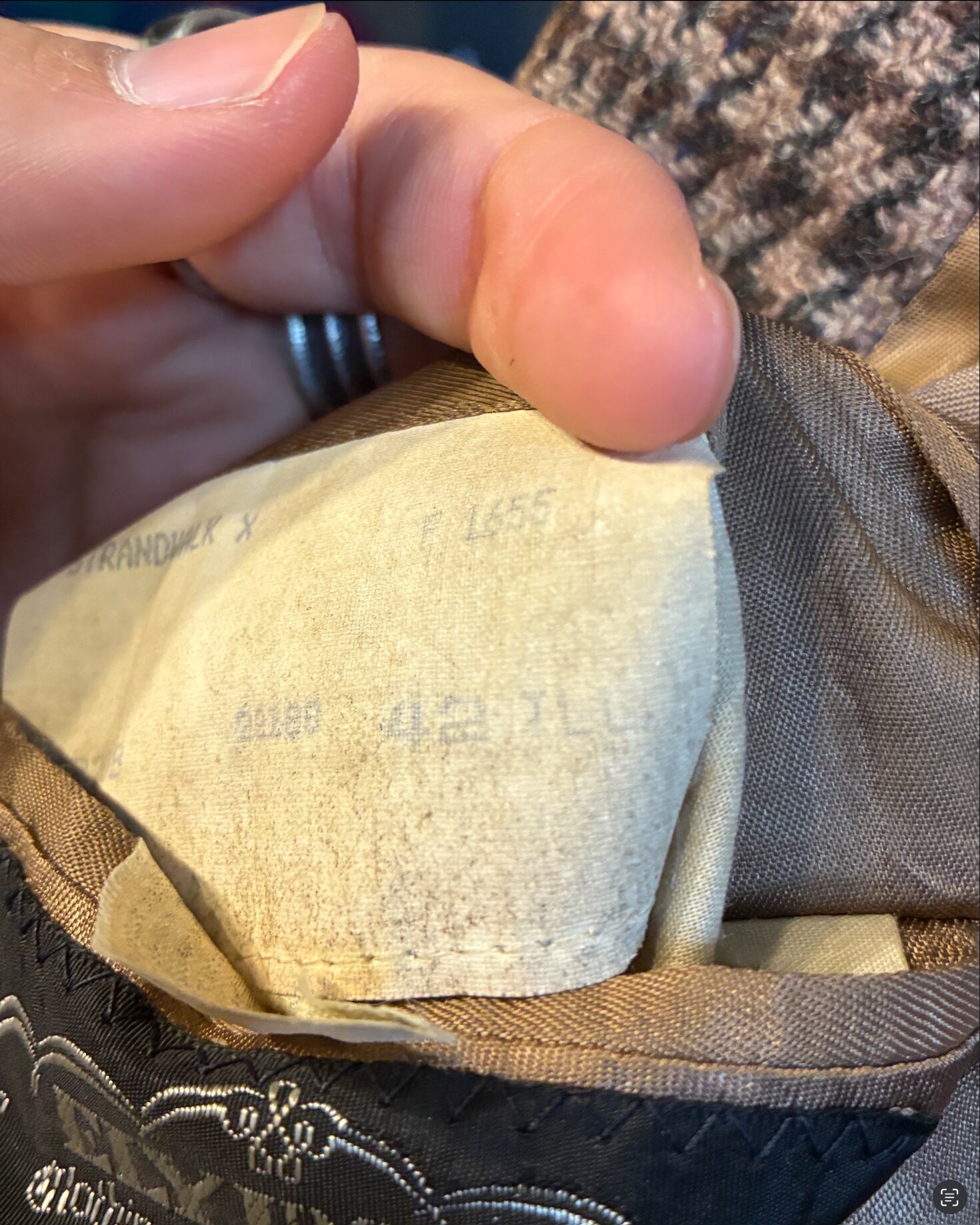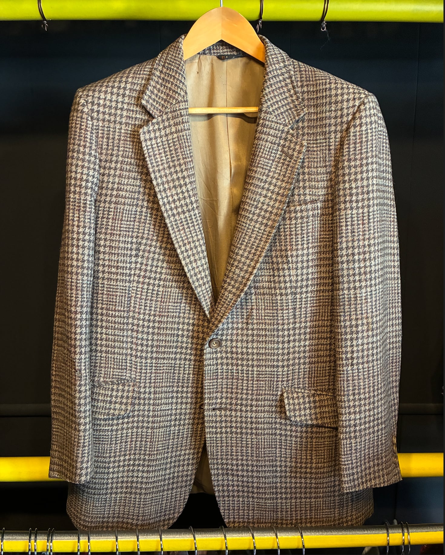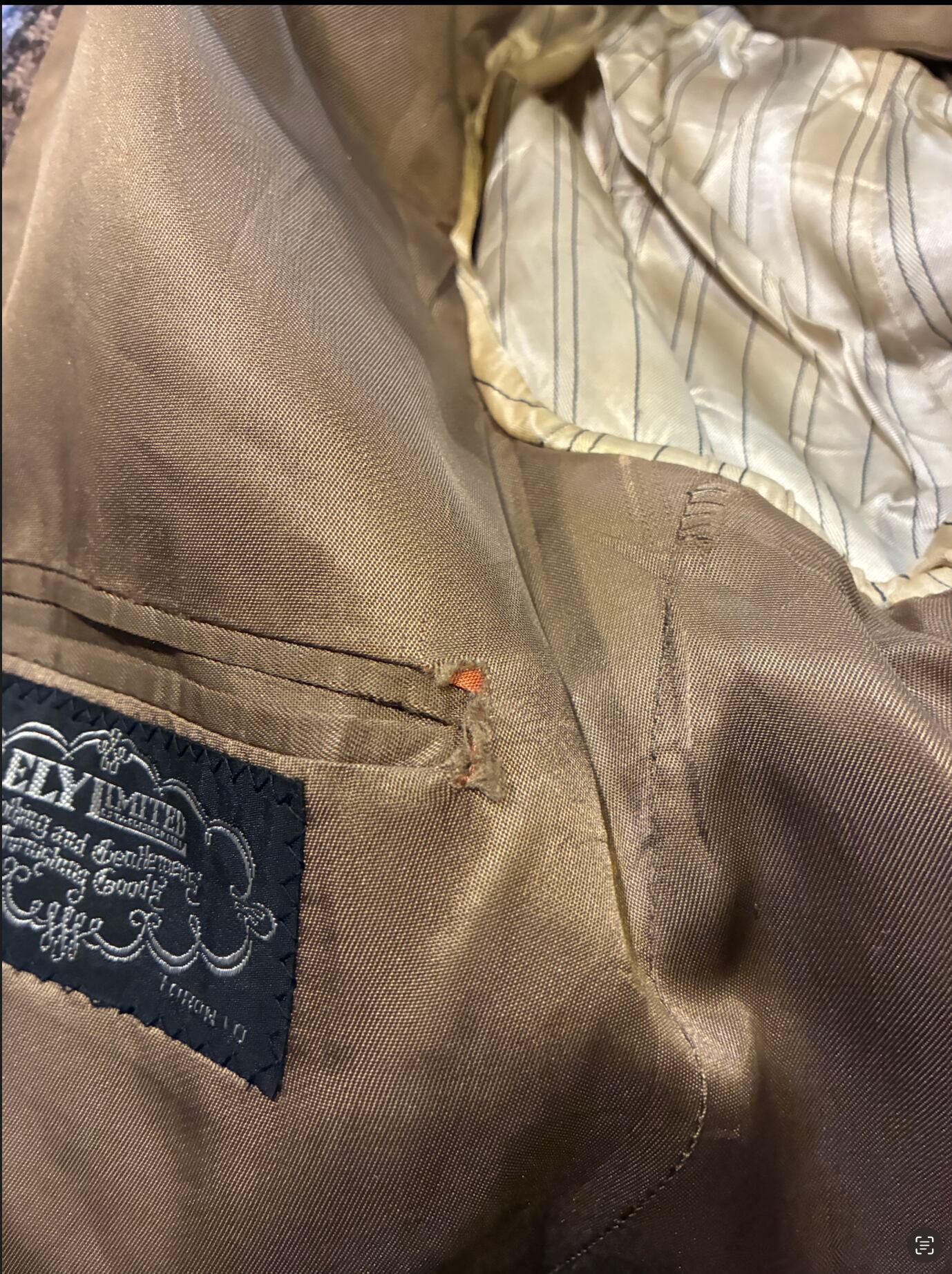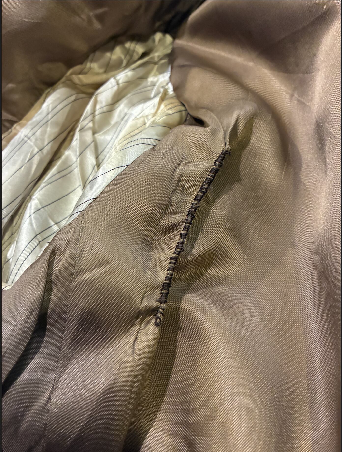 裏地にサテン生地特有の摩耗やリペア跡がありますが、表地は非常に良好なコンディションです。テーラードの特性上、裏地を交換することで末永くご愛用いただけます。