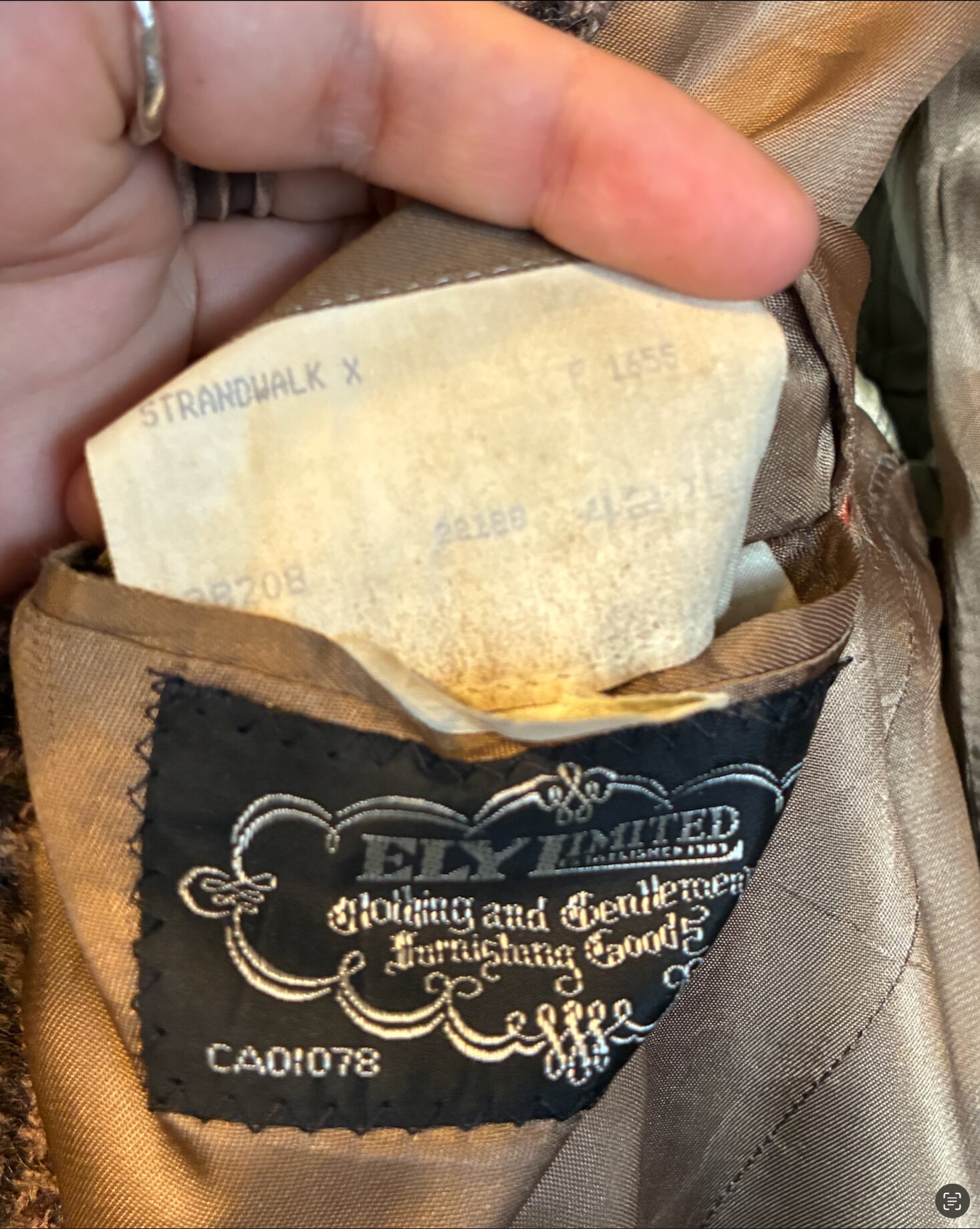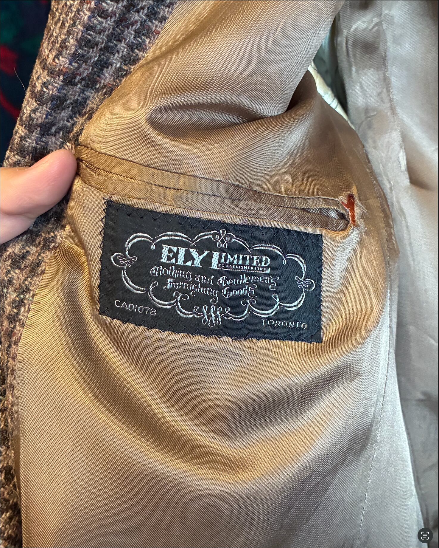 カナダ・トロントの高級店「ELY LIMITED」のラベルが配されており、当時の重厚な仕立てが伺えます。